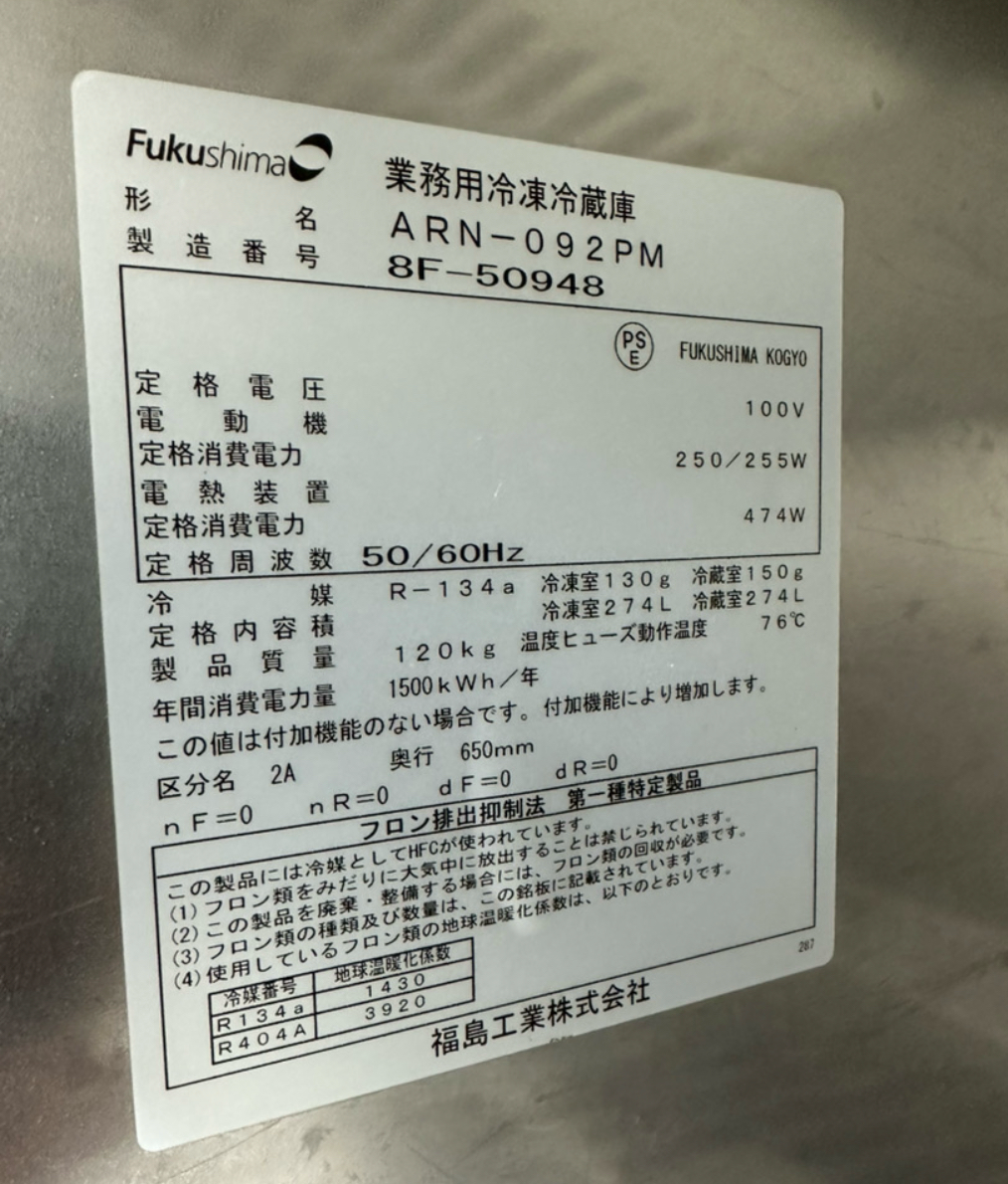 福島工業株式会社/業務用冷蔵庫/ARN-092PM