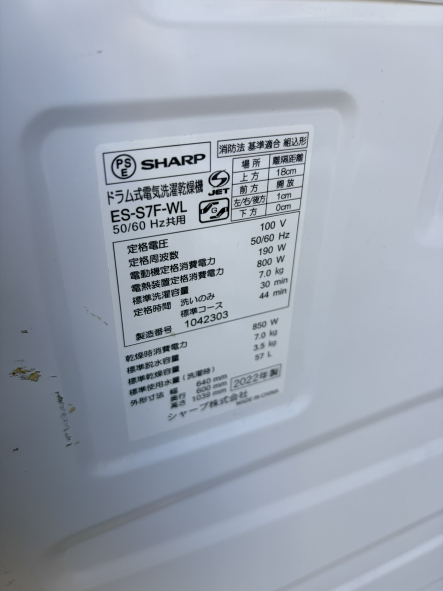 - 種類:家庭用ドラム式洗濯機 シャープ/ES-S7F-WL/2022年製